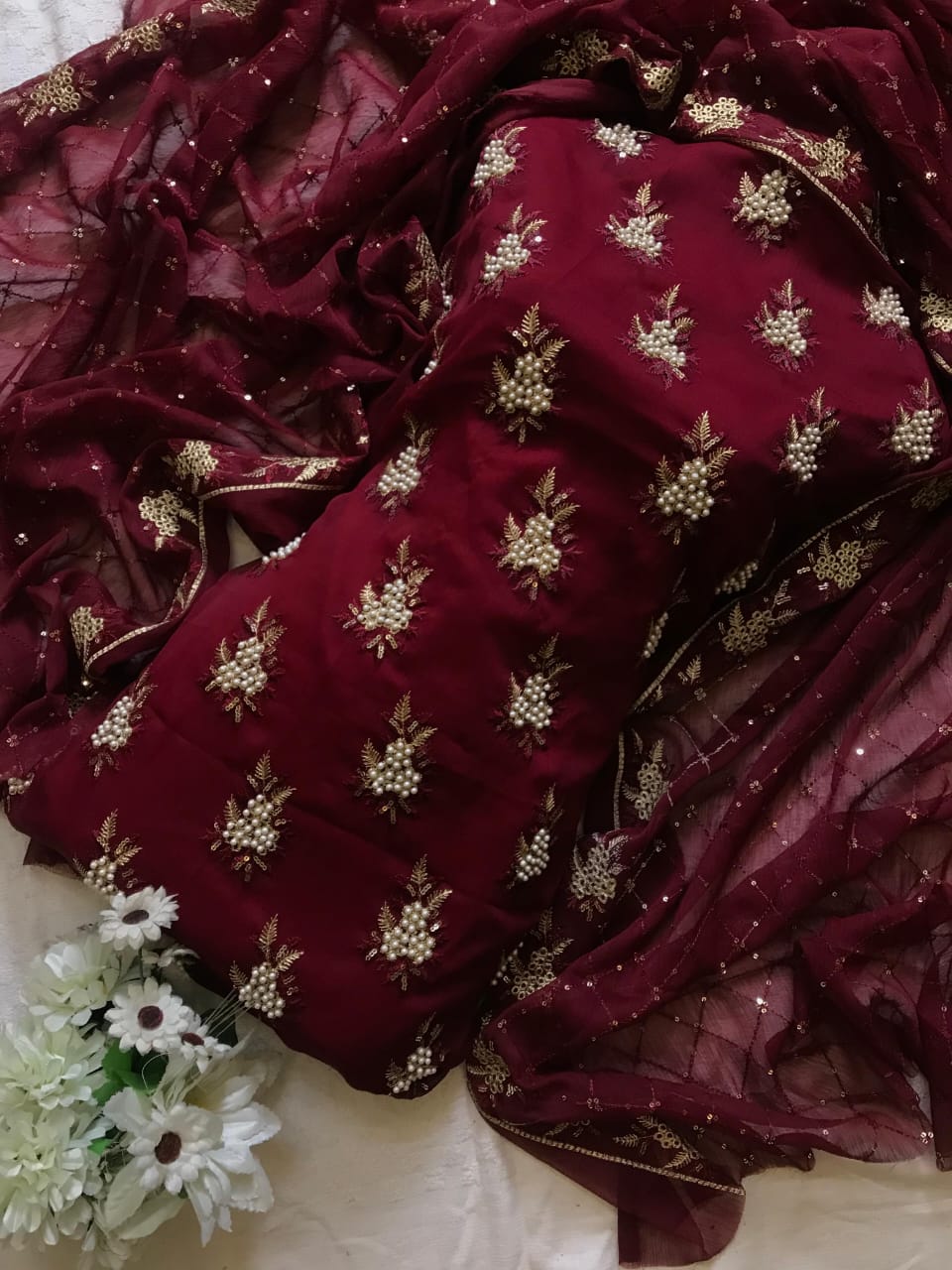 • Resham & Sequins Embroidered Chiffon Shirt with Pearls 2.5 yards