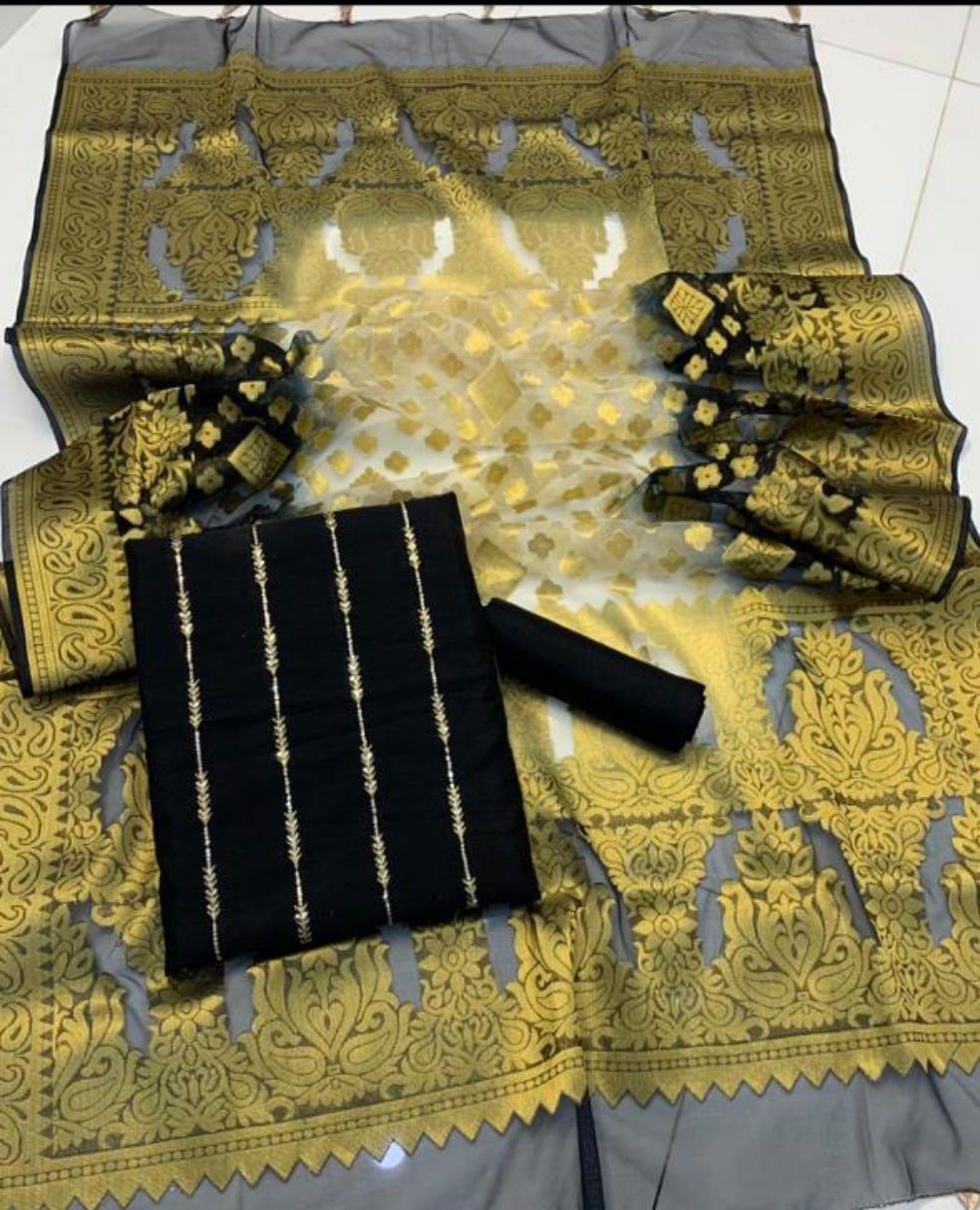 Raw Silk Embroidered Partywear 3pc Dress - Black
